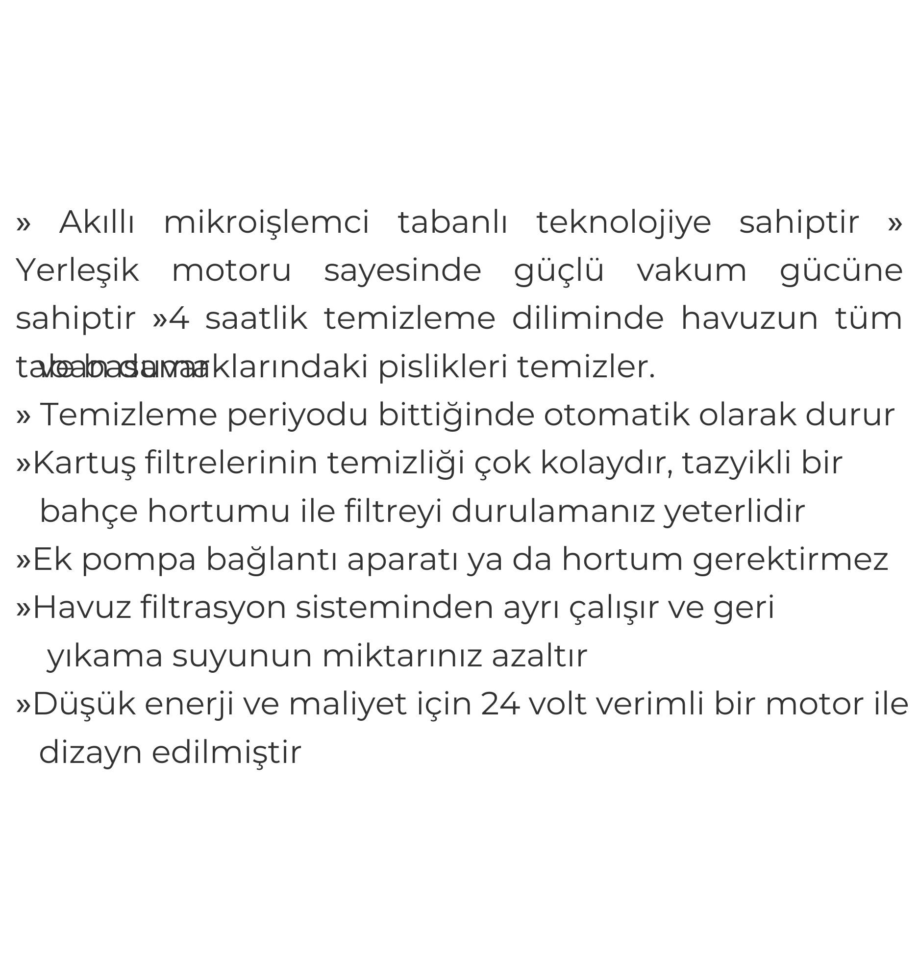 Hayward markasının gelişmiş temizlik teknolojisiyle donatılmış bu akıllı havuz robotu, mikroişlemci tabanlı sistemi sayesinde havuzun tüm tabanını, duvarlarını ve basamaklarını etkili şekilde temizler. 4 saatlik temizlik süresi sonunda otomatik olarak durur. Kartuş filtreleri, sadece tazyikli suyla kolayca yıkanabilir. 16,76 metrelik hortumu sayesinde geniş havuzlarda rahat hareket kabiliyeti sunar. Ek pompa ya da hortum bağlantısına gerek duymaz. Düşük enerji tüketimi sağlayan 24 voltluk motor ile yüksek verimlilik ve maliyet avantajı sunar. Havuz filtrasyon sisteminden bağımsız çalışarak geri yıkama suyu tüketimini azaltır.
