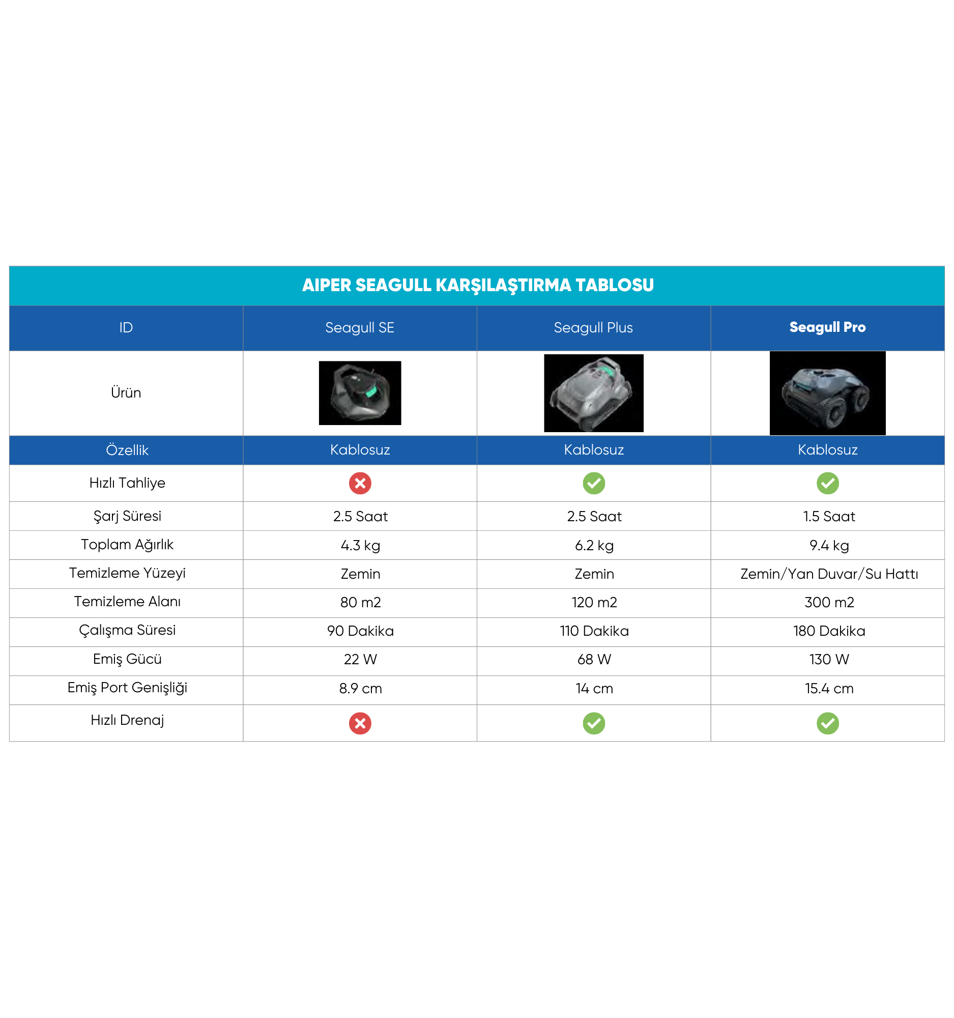 AIPER SEAGULL (SE) PLUS şarjlı havuz temizlik robotu, modern tasarımı ve yüksek performansı ile havuz temizliğini zahmetsiz hale getiriyor. 4,3 kg ağırlığıyla kolay taşınabilir olan bu robot, otomatik temizlik döngüsü sayesinde hem zamandan tasarruf sağlar hem de havuzunuzun her köşesini etkin bir şekilde temizler.