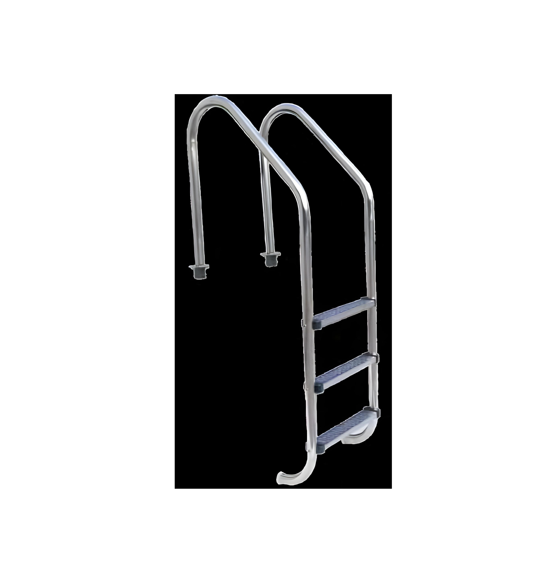 Standart 3 basamaklı paslanmaz çelik havuz merdiveni, kaymaz basamaklı, Ø43 mm çelik borudan üretilmiştir. Montaj parçaları ve rozetler dahil.