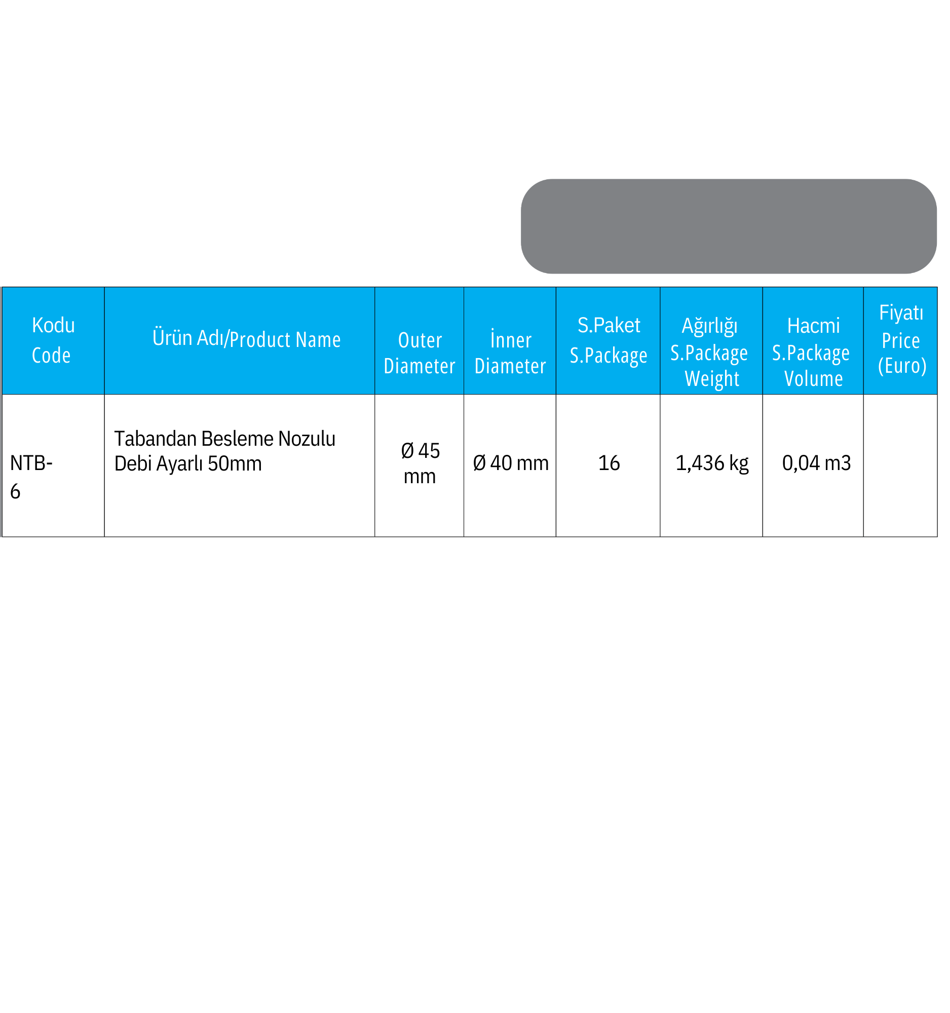 Debi ayarlı, Ø50 mm çıkış çapına sahip tabandan besleme nozulu. Ø45/40 mm bağlantı uyumlu.