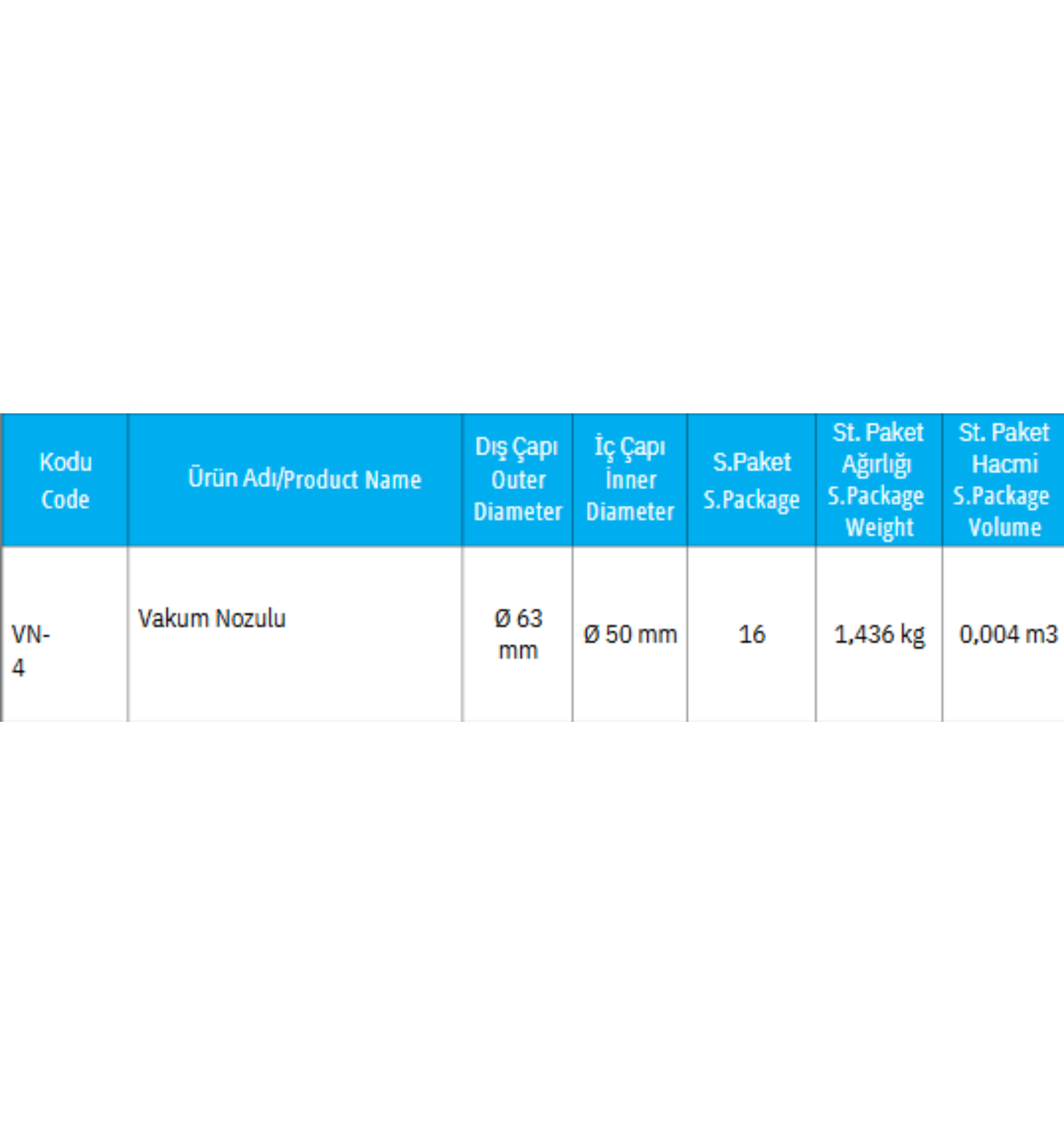 Vakum Nozulu (VN-4), yüzme havuzlarında dip temizliği işlemlerinde kullanılan profesyonel bir bağlantı parçasıdır. Ø63 mm dış çapı ve Ø50 mm iç çapı sayesinde standart havuz sistemleriyle tam uyum sağlar. Yüksek kaliteli dayanıklı malzemeden üretilmiş olup, kolay montaj ve uzun ömürlü kullanım sunar. Set halinde 16 adetlik paketlerde sunulan bu vakum nozulu, havuz hijyeninin sağlanmasında etkin rol oynar.