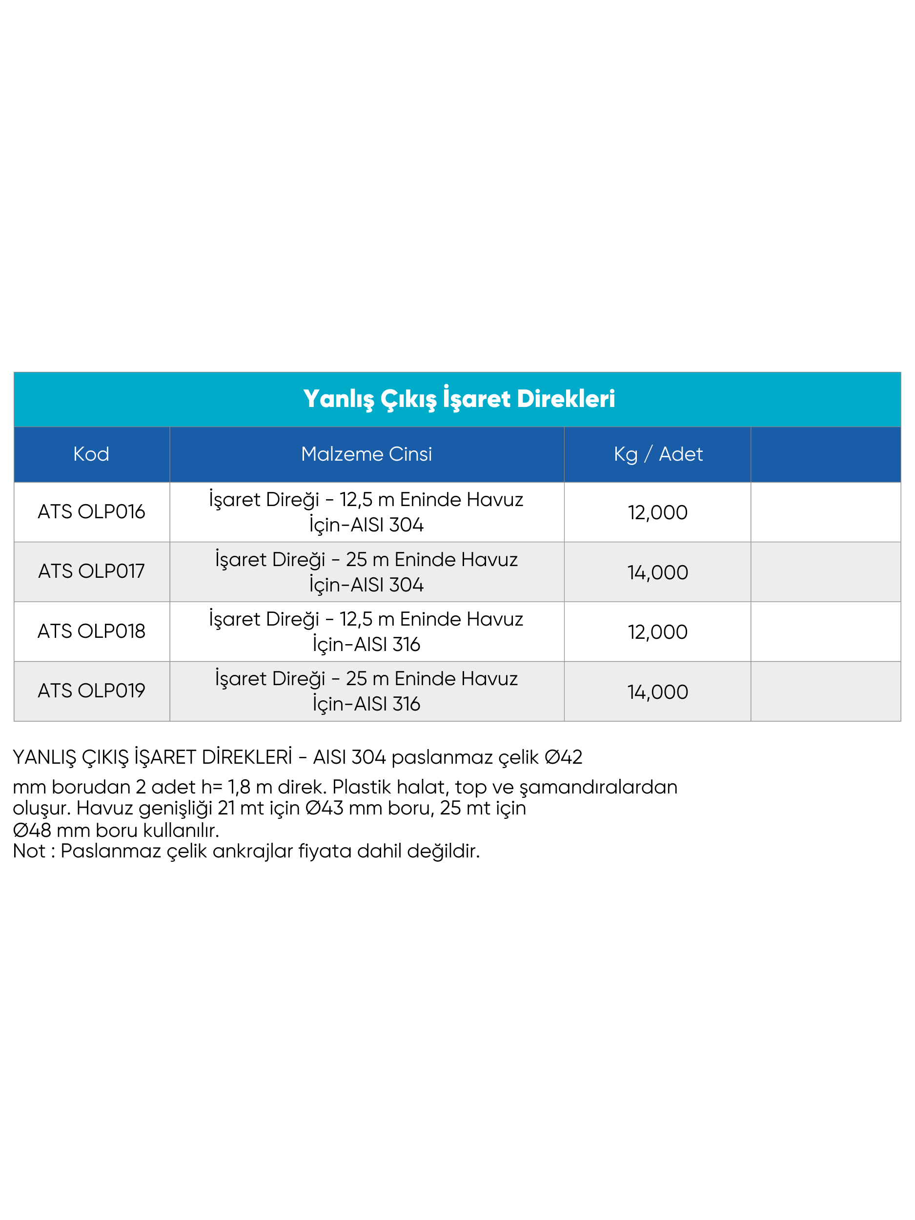 Yanlış Çıkış İşaret Direkleri, yüzme havuzlarında yüzücülerin yönlerini doğru şekilde belirlemeleri için kritik rol oynar. AISI 304 veya 316 kalite paslanmaz çelikten üretilmiş bu direkler, 1.8 metre yüksekliğinde olup iki adet Ø42 mm borudan oluşur. Üzerinde plastik halat, top ve şamandıra detayları yer alır. 12,5 m ve 25 m enindeki havuzlar için farklı modelleri mevcuttur.
