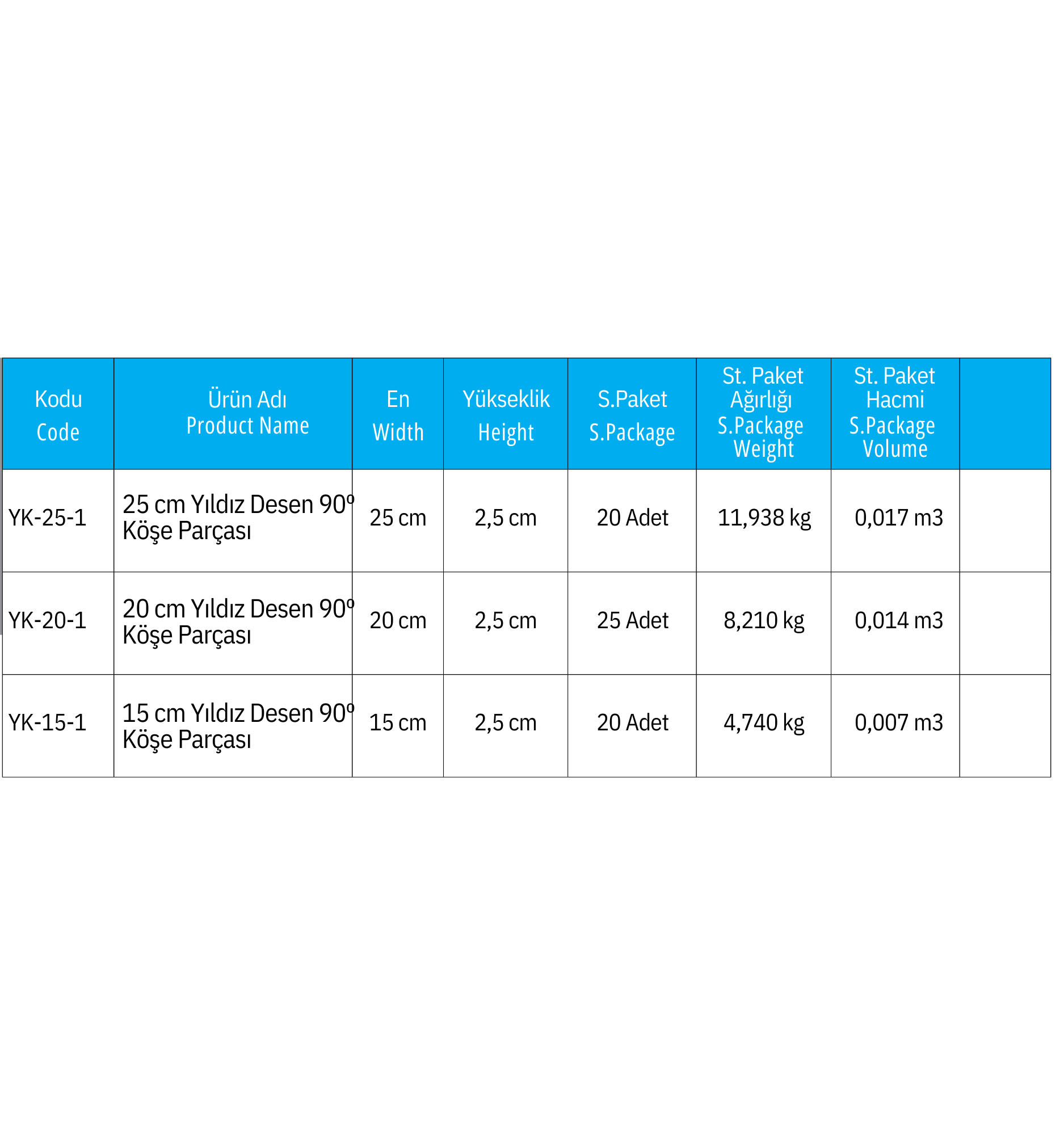 | Yıldız Desen 90° Köşe Parçası | 15 cm Yıldız Desen 90º Köşe Parçası, 20 cm Yıldız Desen 90º Köşe Parçası, 25 cm Yıldız Desen 90º Köşe Parçası |